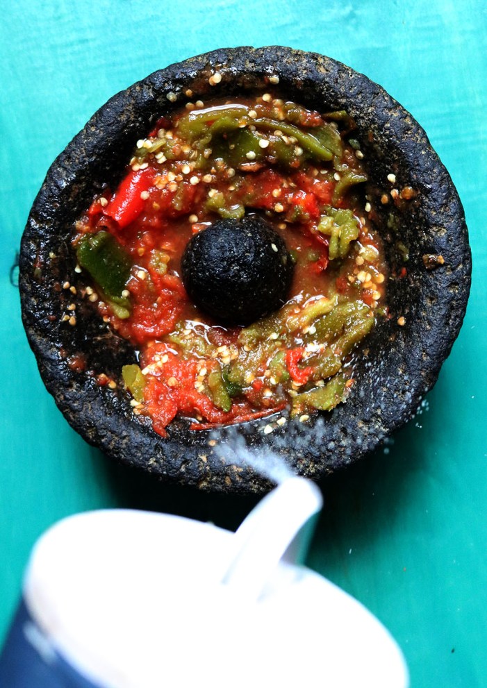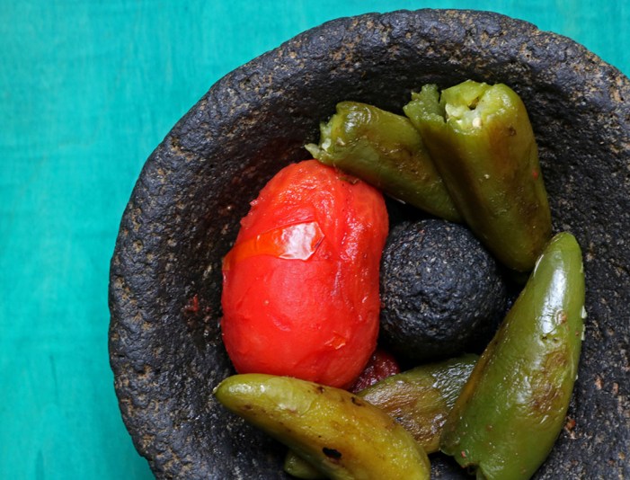 You’re also going to need a molcajete or you can blend the ingredients in the blender, but that’s not as fun as manually grinding everything.