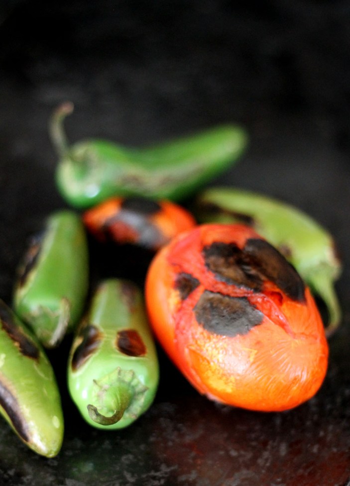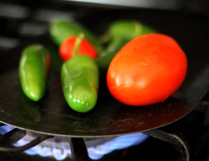 Heat up your comal or pan to medium high heat and throw all the jalapeños and tomatoes on there. Abandon the garlic for now we won’t need that until later. Rotate those guys to where all sides all slightly burned. Use tongs in case you don’t have tortilla flipping hands.
